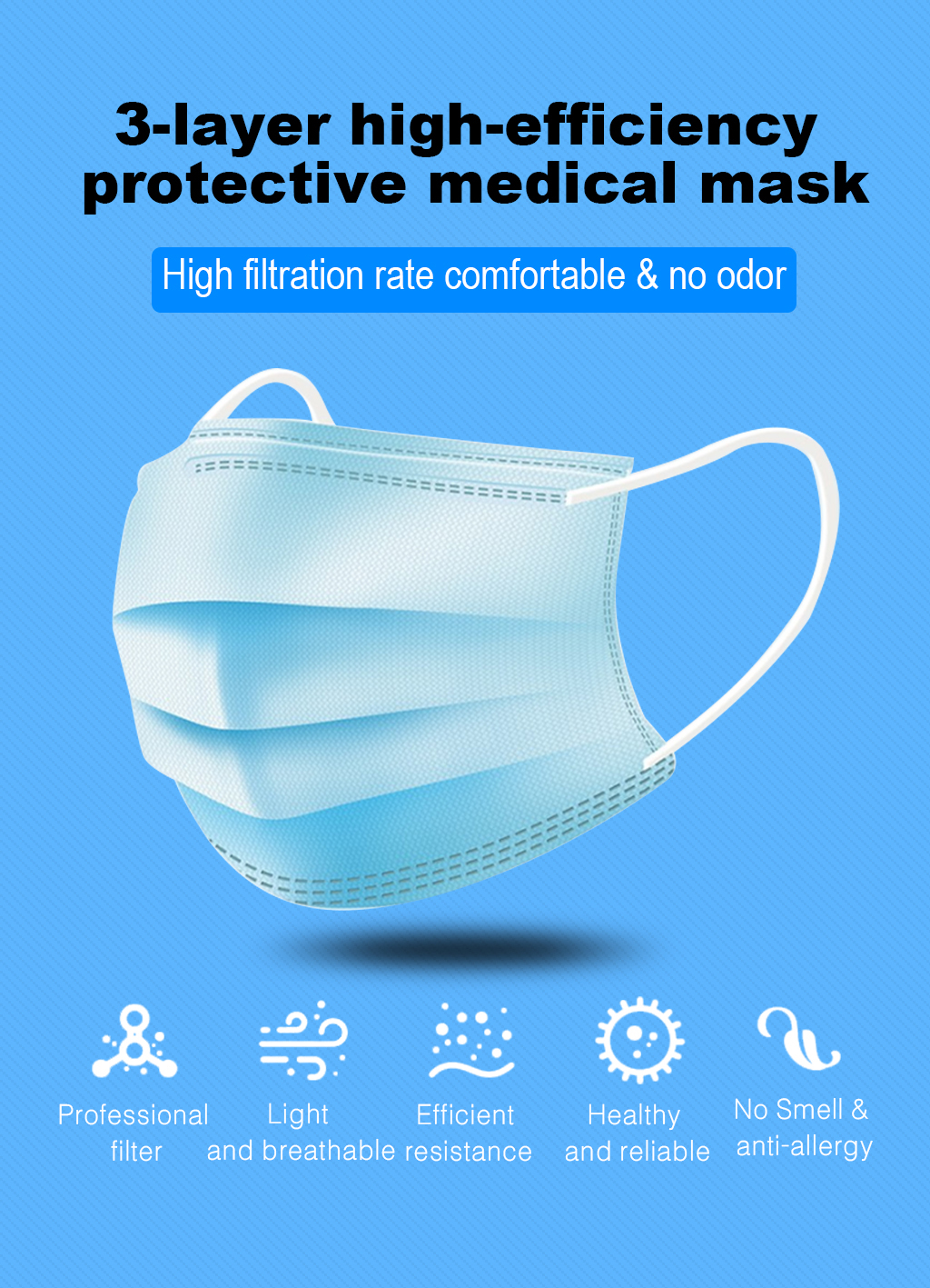A: Our face masks are made of 100% new material, 3 ply non-woven, blue or white color. You can check the packing details in the "Packaging & Shipping" part.