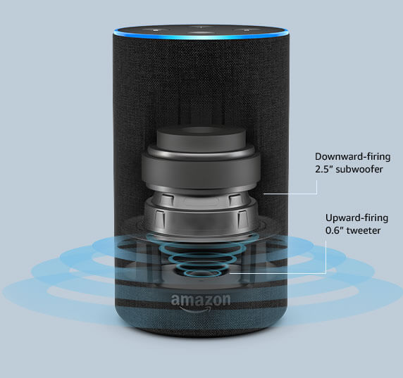 - New speaker, now with Dolby processing for crisp vocals and dynamic bass response. Echo can fill the room with 360° omnidirectional audio. Adjust the treble, mid, and bass levels with your voice.